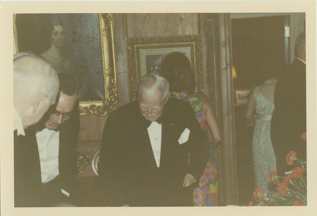 This is a photograph of a formal party hosted at the Nightingale-Brown House. John Nicholas Brown II is in the center of the photograph, wearing a tuxedo.