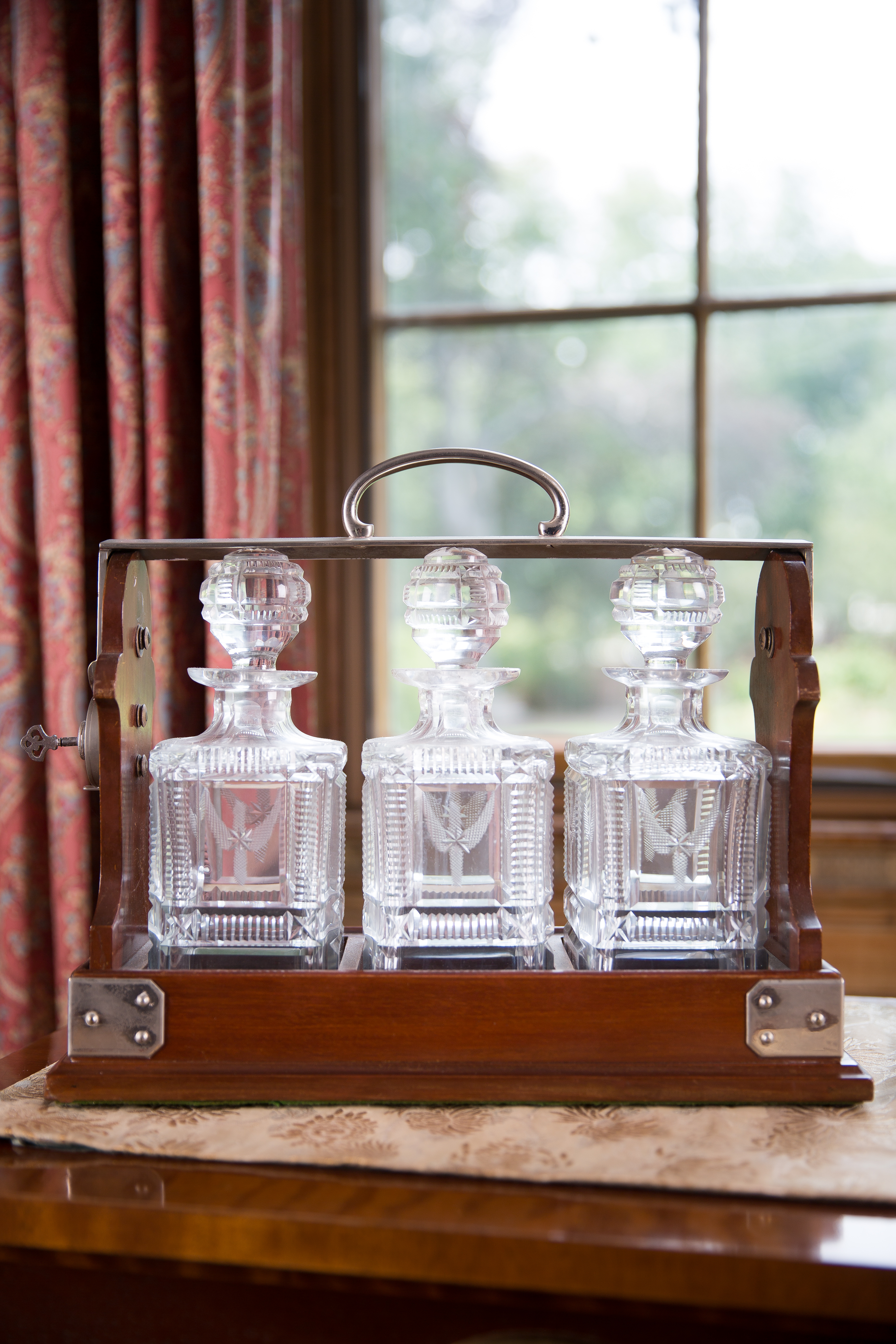 The popularity of cocktails and cocktail parties outlived Prohibition itself: John and Anne Brown enjoyed cocktails in their study after dinner. A decanter set like this one would be used for holding whiskey or brandy, both popular cocktail liquors.
